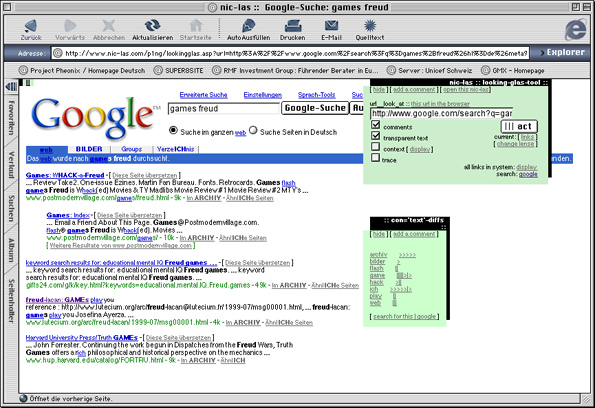 nebenläufigkeit wird zum thema und communitites beginnen mit dem zu spielen, was sie im spiegel ihrer mitwelt wegen sich selbst erleben; dabei ist vom menschen an sich ist nicht viel übriggeblieben. er ist nur noch ein rumpf mit wenigen, hoffentlich ausreichend fundamentalen funktionen. eines der erstaunlichsten konzepte des interaktiven / agierenden zeichens = medien bzw der infrastruktur mensch ist es dabei, sich verschiedener medien bedienen zu können, um sie untereinander zu verknüpfen. aus verschiedenen zeichen werden wieder neue zeichen (die differenzen erzeugen) generiert: der mensch kann steine bearbeiten (vgl. innis und vgl. multimedia bei spoerri), verändern, bearbeiten, umformen --- und neuerdings auch informationen. menschen weiten sich, um verschiedene ansichten generieren zu können, verbinden verschiedene perspektiven auf die welt und legen im zweifelsfall noch ein paar layers drauf. serie [ mechanische bezüge zur intuition ] lacan mirror _ der andere ist immer gefängnis und möglichkeitsstiftend zugleich, der blick des anderen ein spiegel unserer welt, getreu der devise: was bedeutet mir der tag, was bedeutet mir die welt, ich werde sagen, sie seien schön, wenn es in deinen augen steht _ im lacan mirror operieren wir im autologie-mode --- wir sind und können werden, wer (egal ob system, mensch, spiel oder werkzeug) gerade im raum ist, die möglichkeitsräume (virtualität die zur aktualisierung unserer realität zur verfügung steht) ändern sich in jedem spielzug _ wie die vorbeiziehenden landschaften in stalker, mit deren entfaltungen wir manchmal etwas zu tun haben und manchmal auch nicht. konkret medientechnisch ausgestaltet wird das interface zum inter_face, bei dem sichtbarkeiten von denen und dem abhängig sind, die gerade eben angeschlossen sind _ oder so tun, als ob sie in the wired wären. das spiel der zeichen hatte begonnen, der mensch erschien fortan als eine infrastruktur für laufende programme _ "läuffähig auf menschen mit ...." der mensch wurde in unseren digitalen medien als primitives kybernetisches modell (vgl. turing's universalmaschine) implementiert _ die medien haben dadurch neu laufen gelernt, denn die rechner reagieren nicht mehr nur, sie agieren (server) und emanzipieren (auch wenn dieser bezeichnung als politische unkorrektheit wahrgenommen werden kann) sich zu menschenunabhängigen medien (=man könnte fast sagen, weil sie menschlich geworden sind --- zumindest in einem sinn menschlich, wie man den menschen einige jahrhunderte zuvor propagierte _ digitale medien sind zu handelnden gegenübern, zu inter_faces geworden, zu mitspielern, die nach ihren regeln handeln und keineswegs nur noch auf das gegenüber warten _ inter_faces besitzen vielleicht keinen logos, aber loops --- ihr eigenes vor sich hinarbeiten _ inter_faces werden genauso in ihren zirkularitäten wie menschen gefangen, irritiert und aktualisiert; bauen in sich, uns und anderen programmen genauso wie menschen an phantasmen, alter-egos, doubles und spiegelbildern --- die situation des benutzers verschärft sich identitätsmässig drastisch --- angenommen es gäbe für den server noch einen unterschied zwischen dem user und einem programm = users), was bliebe dann einem richtiger user noch übrig zu tun, um nicht mit software verwechselt zu werden (turing test an doom :: is there a dog playing?) _ irgendwann mal hat man dann aus selbstschutz begonnen, den anderen programmen auch zu-zugestehen, menschen zu sein --- dadurch ähneln sie in zunehmendem masse unserer klassischen "umwelt" = "realitäten", die vermehrt ohne den einfluss des immer absorbierteren, eingeloggten menschen vor sich hinrauscht! wie kommen wir da raus --- und wer sind wir dann eigentlich? fragments of a journey _ aktuelle assoziationen zu nic-las an nic-las haben wir noch immer freude, wir spielen gerade mit java prototypen, die auch off-line funktionieren + sich beliebig mergen lassen, was in letzter konsequenz bedeutet, dass die sichtbarkeit von objekten und unterscheidungen davon abhängig ist, wer gerade mitschaut | on-line ist | mit einem einen virtuellen raum von vielen bildet > mit anderen worten, wir fangen an, die beobachter wirklich mitzudenken, indem diese die eine umgebende virtualität (alles was mit der nächsten operation möglich ist) sichtbar konstruieren _ dieses tool trägt den arbeitstitel 1xistenz _ was das bekannte nic-las der zweiten generation angeht, so funktioniert dieses nahezu perfekt, wir haben zum beispiel an www.nic-las.com/matrix jetzt über 1 1/2 jahre gearbeitet, das ding ist riesig und der index könnte aus einer dissertation stammen _ lustig ist dabei auch, dass wir über die server-zugriffs-statistik jetzt sehen können, was andere in uns sehen _ ich sehe jetzt jeden tag mit gespannter erwartung den news in der matrix entgegen _ gespannt mit welchen suchbegriffen die zur zeit 10-15 anderen uns in der matrix finden _ die suchmaschinen tragen damit zu unserer identitätskonstruktion bei --- was die ixtensions zu nic-las angeht, haben wir neben dem looking-glas-tool auch den carpet in ein beta-stadium gebracht --- dies erlaubt ein arbeiten, während der carpet in nebenläufige prozesse engagiert relevante assoziationen endo + exo zusammen-zieht) _ es gibt natürlich auch viele detail verbesserungen --- etwa die rhizom (alternative zur struktur) navigations- + orientierungs-ansicht oder die möglichkeit, programme (z.b. flash und java), die sich gerade selbst ausführen, in nic-las als objekte einzubauen _ erste prototypen bemühen bei jedem zusammenzug google und google-image-search, um assoziationen zum gerade sich-im-zusammenzug-befindlichen geradezu mechanisch herzustellen _ wenn man das zu ende denkt, dann können innert sehr kurzer zeit die ixtensions das bisherige nic-las (den bisherigen kernel) virtualisieren. |