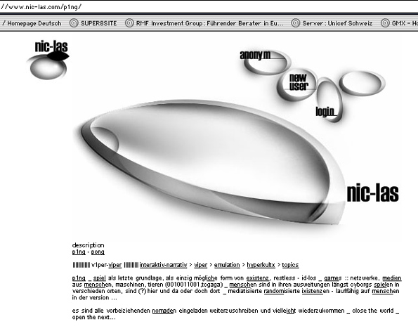 of your community: ein gutteil der faszination digitaler games liegt in deren technisch angelegten möglichkeit, nebenläufige prozesse ins geschehen mit einzubeziehen. dieser überlegung folgend geht es in nic-las um spiel mit text und anderen zeichen --- verstanden als gewebe aus netzwerken und rhizomen, das einen fiktiven, virtuellen raum zusammenhält und dadurch real lesbar macht. spiel-räume, in denen alles, was schonmal im system reproduziert wurde, wieder potentiell als (bestand)teil für überraschende zusammenzüge sichtbar und verfügbar gehalten wird --- wobei dieses virtuell definierte alles sich mit jedem schritt aller mitspielenden menschen, maschinen und hybride aktualisiert. die darin angelegten aktualisierungen realisieren sich immer als ausdruck der zur verfügung stehenden mechanischen bezüge zur intuition, deren es mannigfaltigste gibt. was mag man sich darunter vorstellen? in der entwicklung von www.nic-las.com integrierten wir z.b. ein sogenanntes "digitales unbewusstes" und "dynamische objekte". so ist zum beispiel das digitale unbewusste eine nachbildung des konzept des unbewussten wie es mitte des 19. jahrhunderts entstand --- bis anhin implemetierten wir 2 varianten :: _freudsches unbewusstes ::